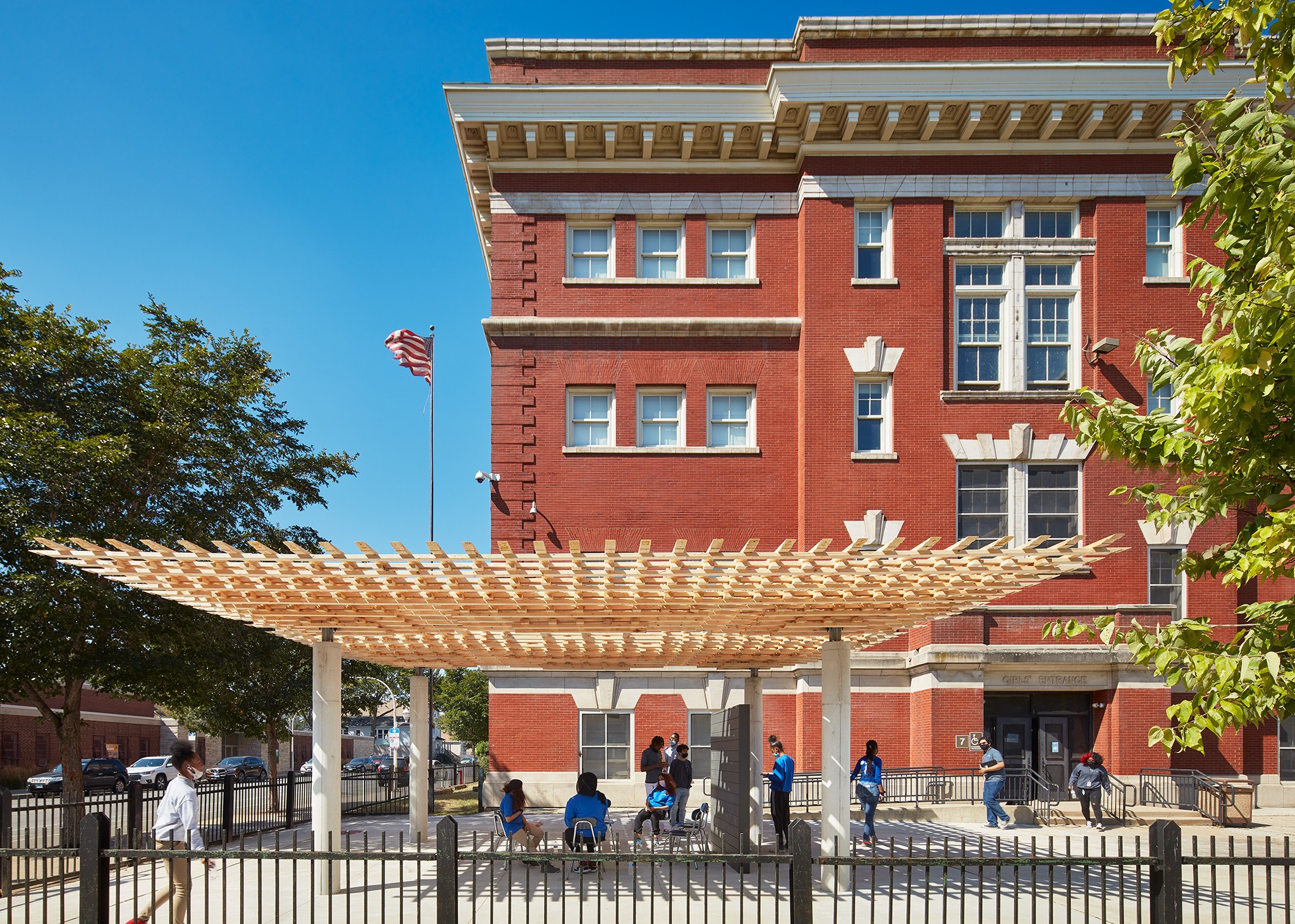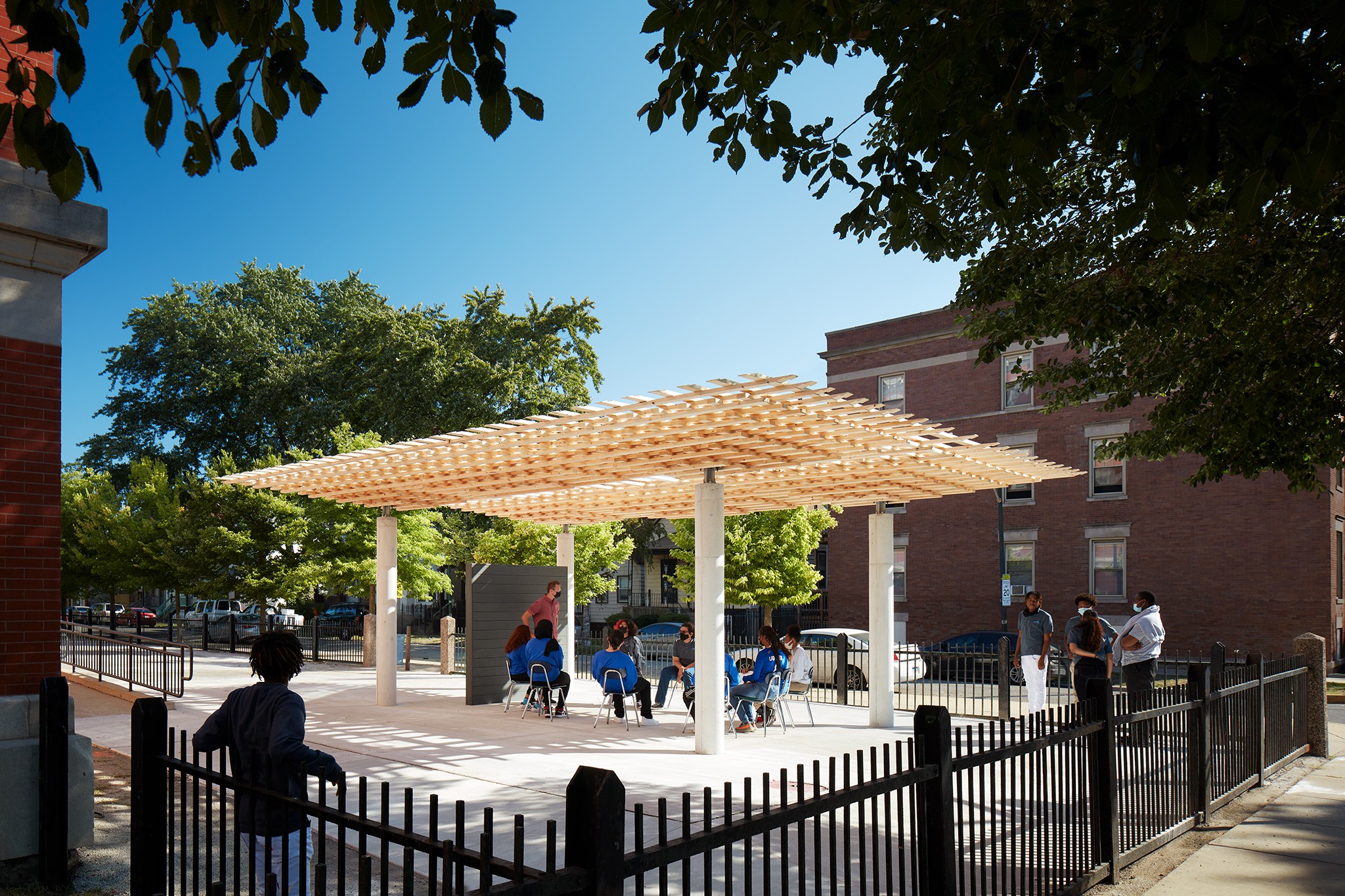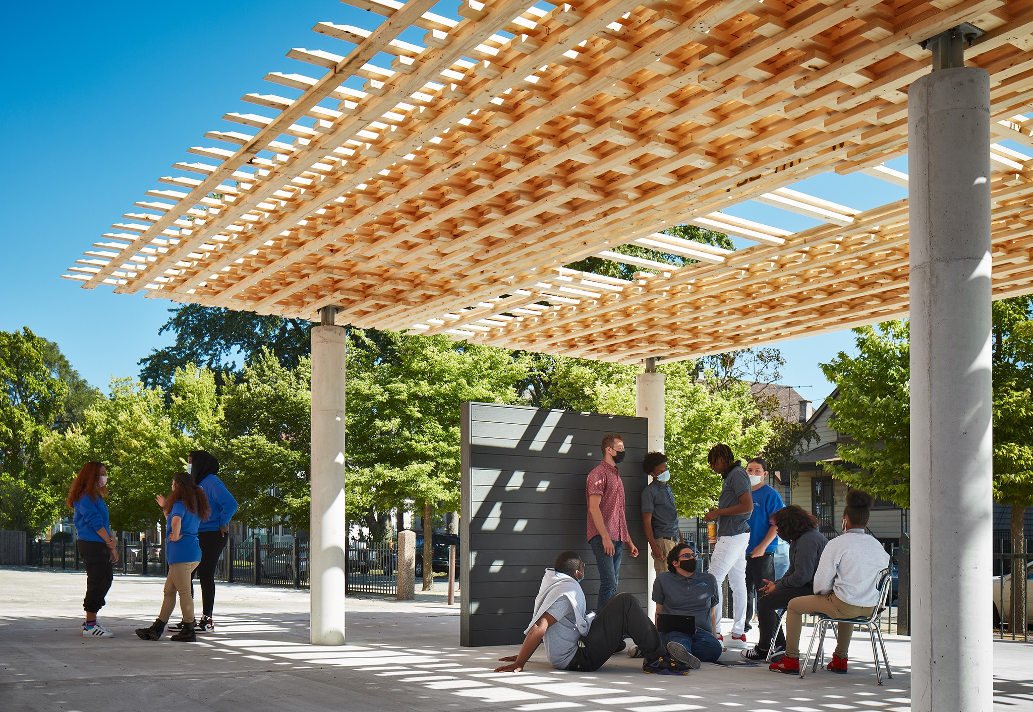 Designed and fabricated by SOM and the University of Michigan Taubman College of Architecture and Urban Planning, the pavilion is an open-air learning lab and gathering space for a school in Chicago’s South Shore.